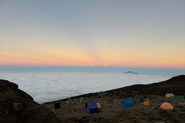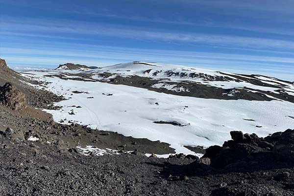 Ascending, we now pass the last watering point, walking onto the saddle of Kilimanjaro between the peaks of Kibo and Mawenzi. Vegetation begins with upper heathland but then disappears into “moonscape”. Dinner, rest, and prepare for summit climb.